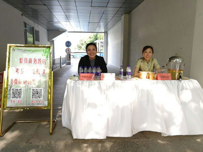 一年一度的高考正在進(jìn)行中,紫藤商務(wù)酒店在揚(yáng)州中學(xué)考點對面設(shè)置了“高考愛心服務(wù)站”,擺放了熱心助考宣傳欄,配備飲用水、銀耳羹、扇子等,貼心為考生和在外等候的家長們服務(wù)。
