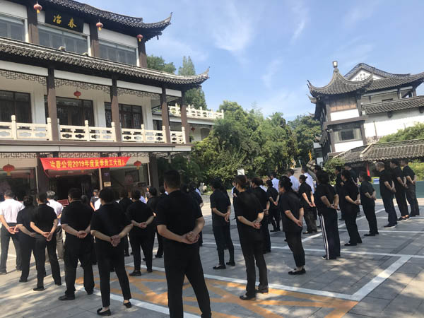 參與此次“夏季大練兵”的人員,總經(jīng)理到計時工,50后一直到90后,全體員工一視同仁,分批次在冶春御馬頭店進行輪訓。內(nèi)容涵蓋軍訓服務技能培訓,軍訓主要包括稍息、立正、轉(zhuǎn)體等隊列訓練,服務技能培訓主要包括服務站姿和托盤等技能訓練。