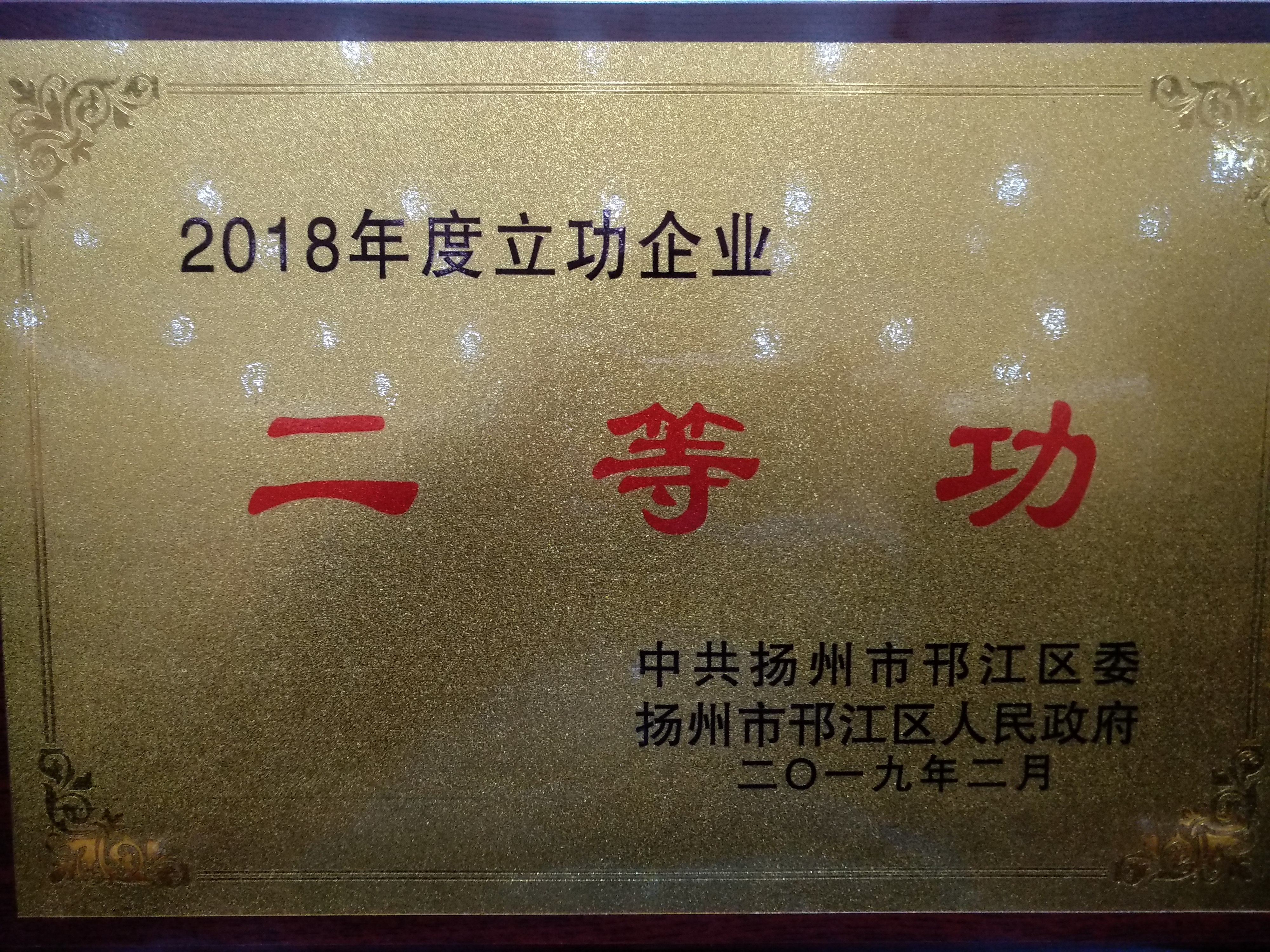 冶春食品榮獲“邗江區(qū)2018年度立功企業(yè)二等功”稱號