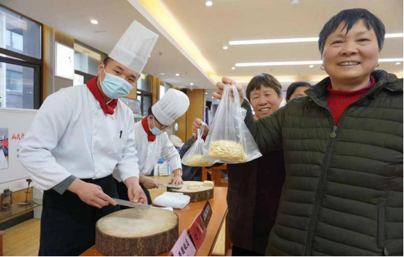 飯店年輕的大廚們一早就搭起了志愿臺,為轄區(qū)居民展示了絕活劈干絲,居民們一邊排著長隊,一邊贊不絕口的發(fā)出感慨:“這刀工真是好??!”還有的居民們提著大廚們劈好的干絲,饒有興趣的和他們探討起如何才能做出口味鮮美的揚(yáng)州特色菜“雞火煮干絲”的制作工藝。