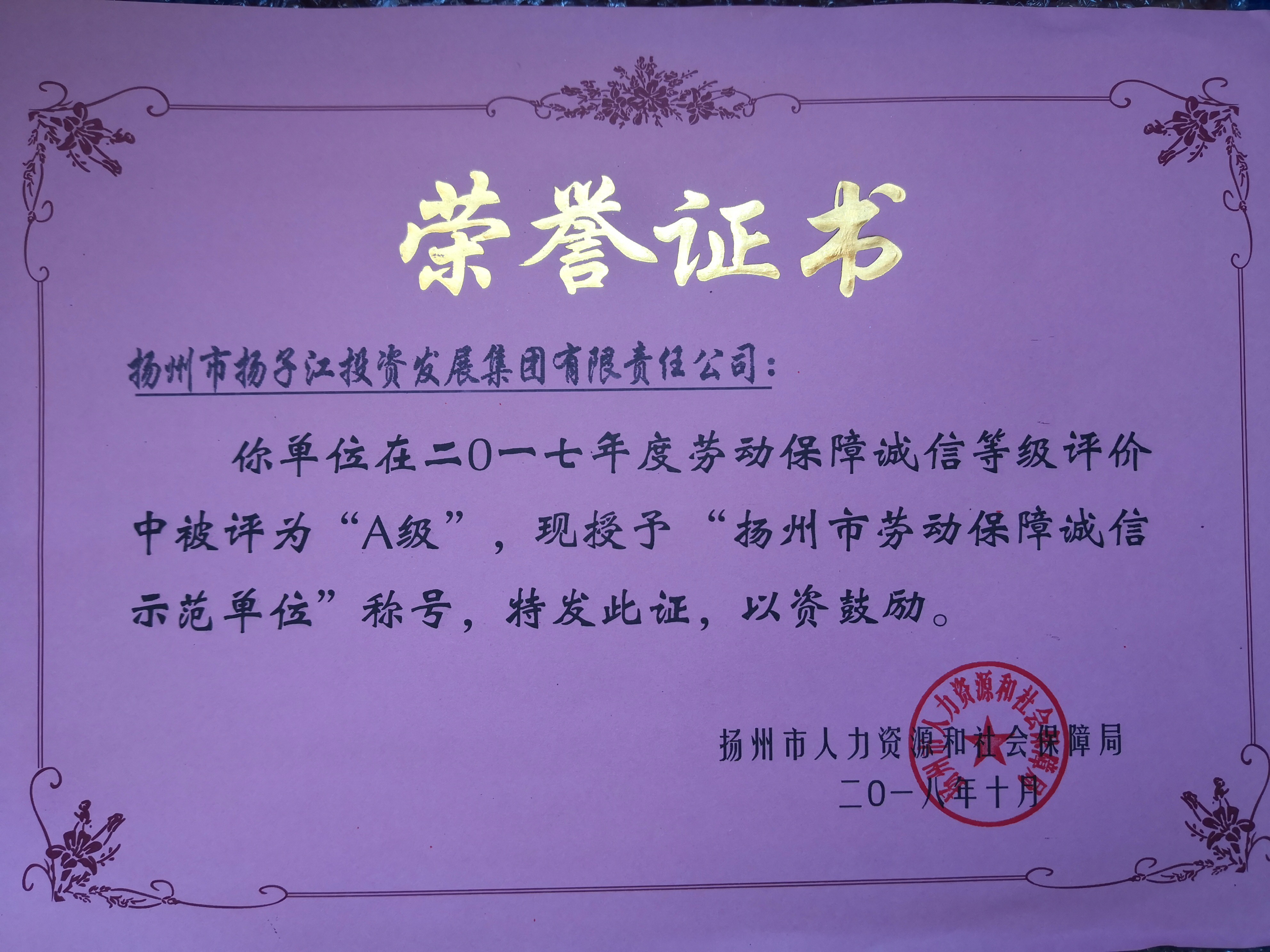 集團(tuán)及所屬4家企業(yè)被評為“2017年度揚州市勞動保障誠信示范單位”