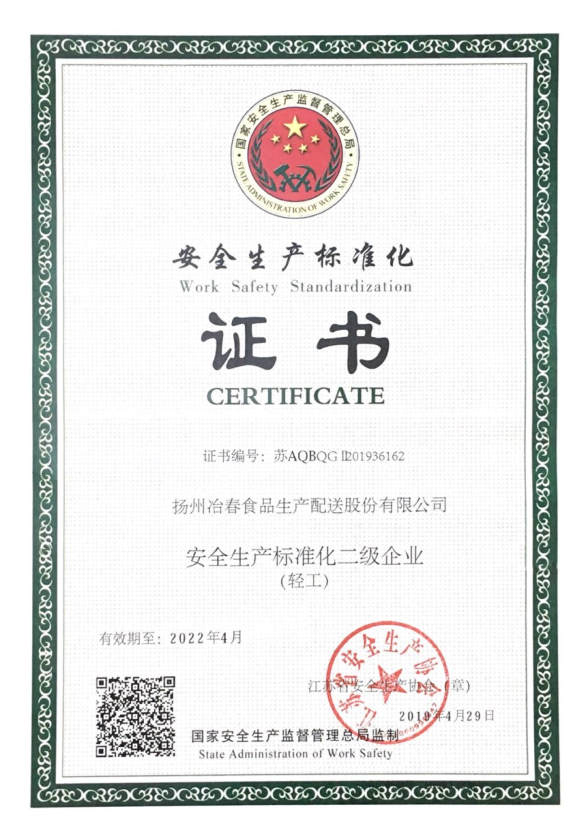 冶春食品被評(píng)國家級(jí)安全生產(chǎn)標(biāo)準(zhǔn)化二級(jí)企業(yè)
