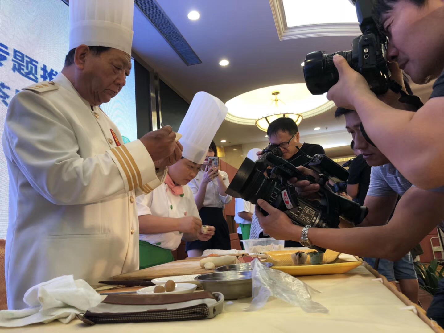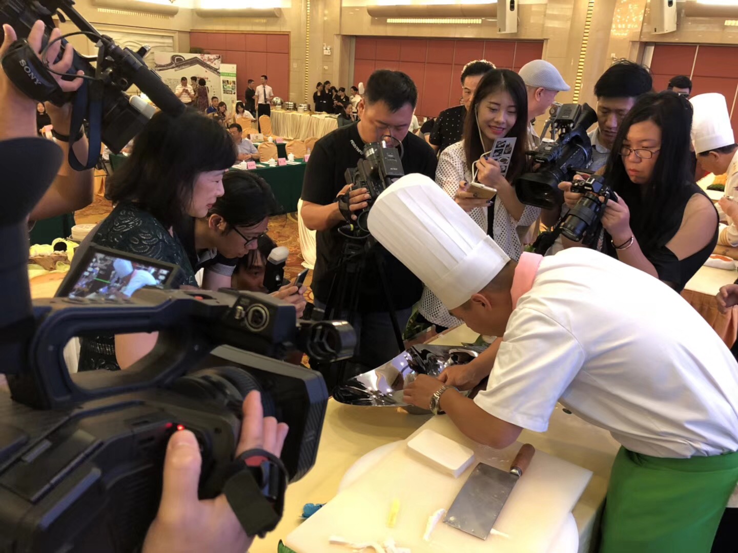 活動(dòng)當(dāng)天,冶春餐飲公司總經(jīng)理陳軍帶領(lǐng),非遺大師陳恩德領(lǐng)銜的揚(yáng)州冶春點(diǎn)心團(tuán)隊(duì)現(xiàn)場(chǎng)展示了花式面點(diǎn)表演、浮雕瓜盅、蒙眼切文思豆腐、繡球豆腐、豆腐穿針等技藝;廣州點(diǎn)心團(tuán)隊(duì)的《廣東家宴》創(chuàng)始人劉正、廣東“食神廚王”李智明、廣州十大名廚黃認(rèn)穩(wěn)等名廚也紛紛登場(chǎng)亮相,進(jìn)行廣州點(diǎn)心的技藝展示,他們精彩的表演讓現(xiàn)場(chǎng)觀眾拍案叫絕。