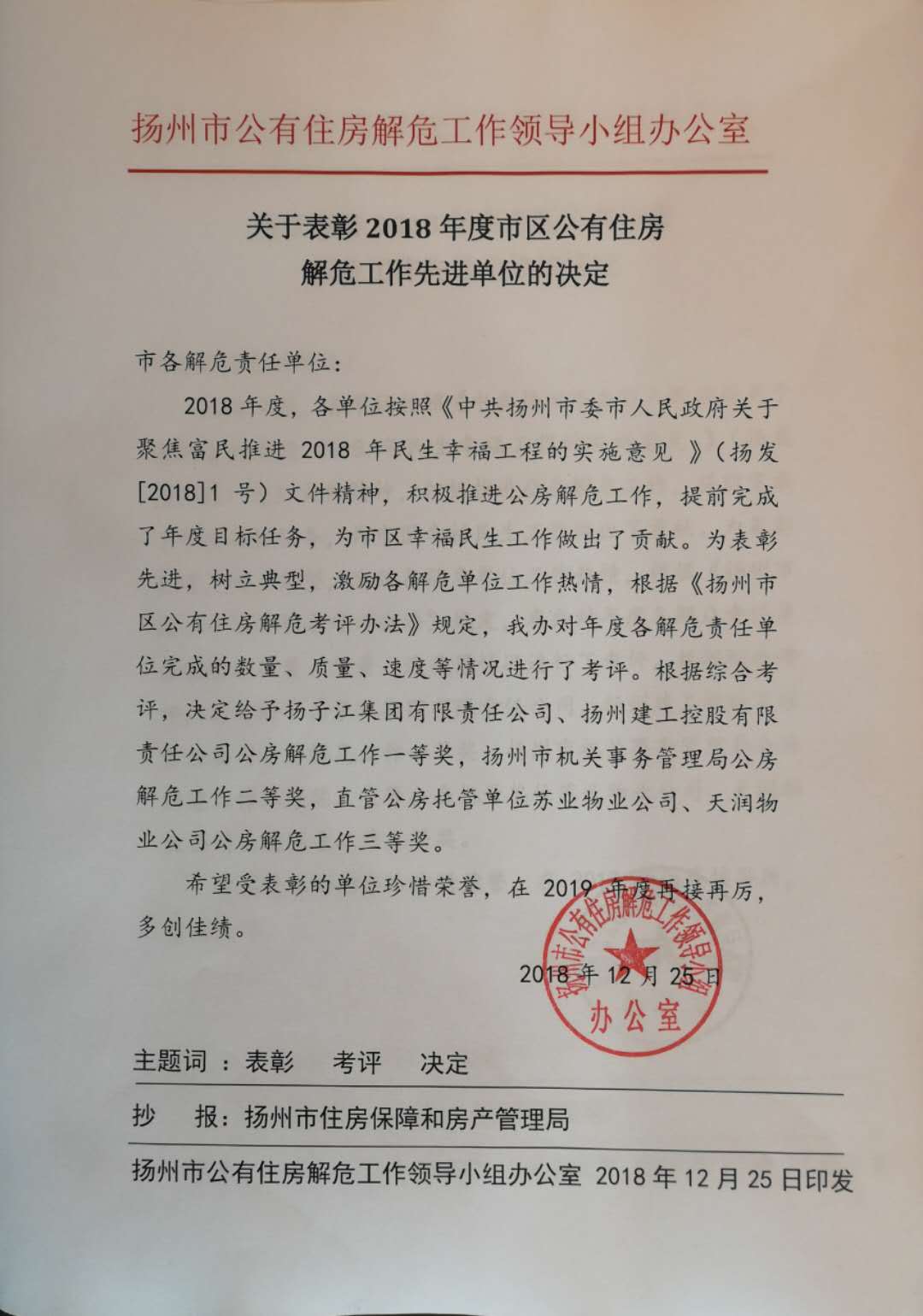 近日,揚(yáng)州市公有住房解危工作領(lǐng)導(dǎo)小組辦公室公布《關(guān)于表彰2018年度市區(qū)公有住房解危工作先進(jìn)單位的決定》,揚(yáng)子江集團(tuán)承擔(dān)的1000平方米解危任務(wù)在數(shù)量、質(zhì)量和速度上均樹立了典型,榮獲公房解危工作一等獎(jiǎng)。 為落實(shí)2018年市委、市政府1號(hào)文民生幸福工程公有住房解危任務(wù),集團(tuán)高度重視,由集團(tuán)副總經(jīng)理朱定金分管牽頭,率領(lǐng)物資控股公司積極面對(duì)和處理改革改制歷史矛盾,對(duì)照政策,分解任務(wù),積極與城管局、規(guī)劃局等部門溝通,優(yōu)化施工修繕程序,按序時(shí)推進(jìn)解危工作。解危過程中,為贏得危房住戶理解支持,物資控股公司經(jīng)常性現(xiàn)身說法,擺事實(shí)、講政策,多方動(dòng)員;為了照顧困難群體,多次與市解危辦協(xié)調(diào)申請(qǐng)相應(yīng)減免和補(bǔ)助政策;平時(shí)加強(qiáng)危房安全巡查,在冬夏季安全事故高發(fā)期粘貼安全隱患告知書、置放安全警示標(biāo)志等,認(rèn)真做好房屋維護(hù)和日常安全防范。全年共計(jì)完成1069.64㎡解危面積,超額完成既定任務(wù),為市區(qū)民生工作作出了積極貢獻(xiàn)。(物資控股公司 張琦) |